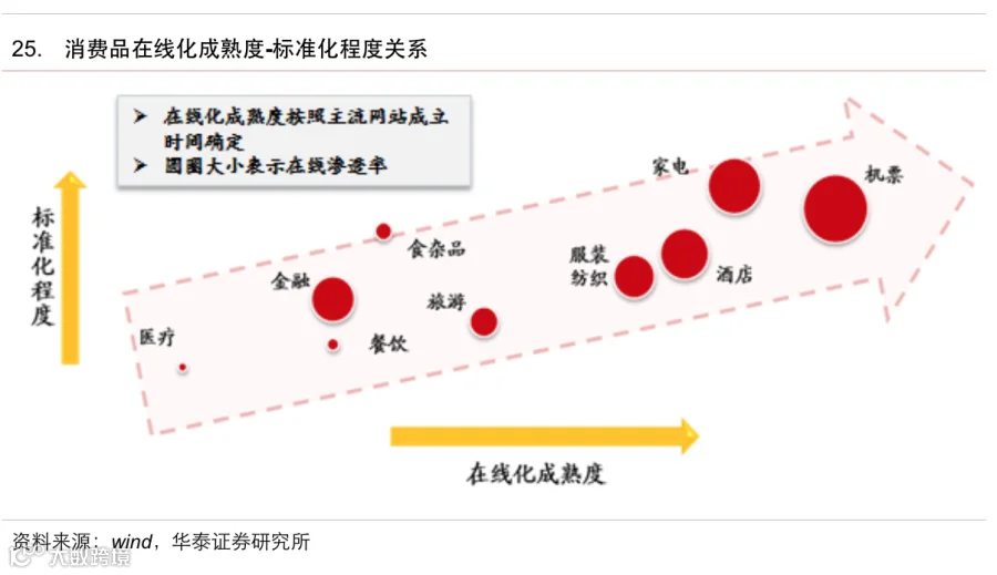 O2O的市场空间有多大?主要取决于产品/服务的非标准化程度。在“在线化成熟度-标准化程度”的二维坐标系下,大消费产业中越是标准化程度高的领域,在线纯平台的渗透率就越高,基本呈线性分布状态。