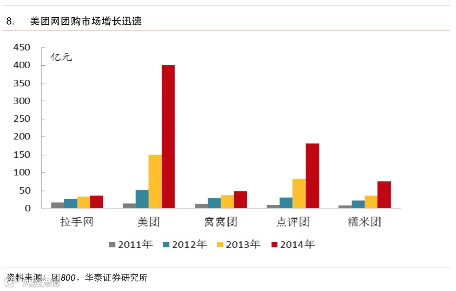 根据美团网提供的数据,其2014年的交易量达到460亿,其中90%以上来自移动端交易。美团网的用户数超过2亿,覆盖城市联络点近1000个,其中美团网占据市场份额第一的城市达到778个。而在合作商户方面,美团网在全国范围内与超过80万家商户达成合作,较去年增长300%以上。