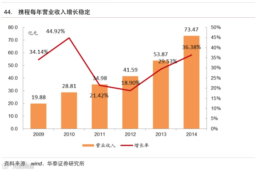 根据携程年报2014年公司净营业收入为12亿美元,同比增长36%;不计股权报酬费用,2014年归属于母公司净利润为1.19亿美元,同比下降49%。其中两大主营业务增长迅速,2014年住宿预订量同比增长63%,营业收入5.16亿美元,同比增长45%;交通票务预订营业收入4.75亿美元,同比增长36%。