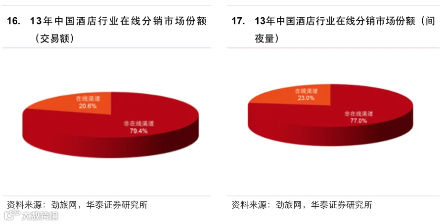根据劲旅资讯,2013年,中国酒店行业总交易额约为2986.3亿元,其中在线酒店市场交易额约为614.6亿元,占中国酒店市场总交易额的20.6%。其中,通过携程旅行网产生的酒店业务全年交易额约占在线酒店市场总交易额的28.7%,位居第一。艺龙旅行网占比约为14.1%,在在线旅行商(OTA)中排名第二。平台型旅游网站中,通过去哪儿网平台商户产生的酒店业务全年总交易额占比约为4.4%,位居平台类网站第一。2013年,中国酒店行业全年总间夜量约为10.29亿间夜,其中在线酒店市场总间夜量约为2.37亿间夜,占酒店市场总间夜量的23%。