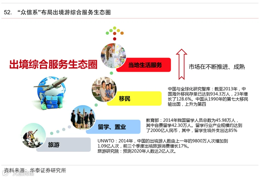 “一带一路”大背景下,众信立足出境旅游,向出境教育、移民置业等海外服务延伸,逐渐形成统一的综合出境服务平台,建立全新的“出境云”大数据分析管理平台。“一带一路”大国崛起背景下周边外交生态圈的重构才是真正的全景,相较于货物和资金要素的流动,人的流动才是根本,中国人迎来了“走出去”的大机遇,这将带来国人出境综合服务的巨大市场。在此背景下,公司年报中透露,将适时向游学及留学教育、移民置业、医疗体检、出境及海外金融、保险等各类出境服务业务领域拓展,打造出境综合服务平台。目前来看,众信旅游已通过收购控股乾坤运通,取得了个人外币兑换业务资质,成为北京市首家能够提供个人外币兑换业务的旅行社,作为众信打造旅游金融服务的一项开端,也是开始试水综合出境服务生态圈的标志,预计后期将随着外延式扩张一一落地,后期成长空间巨大。