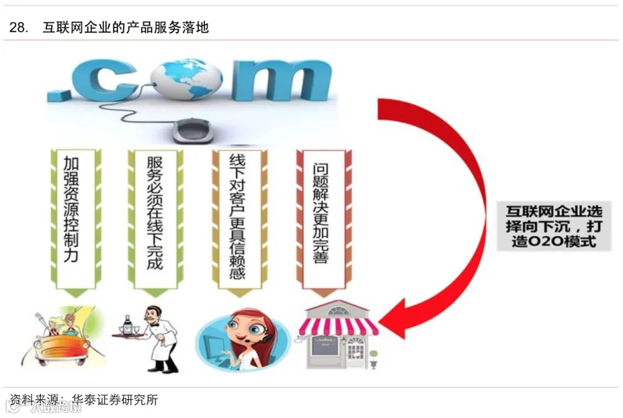 预期差造就触网传统企业的投资价值,“可感知的服务才是硬道理”促使互联网企业产品落地。部分传统企业全面转型触网,经历了内部组织调整的痛苦洗礼后进入“融合期”,转变为垂直细分企业。这些企业扎根于产业链深处,或凭借资源掌控优势、或凭借物流服务管理体系,加上与互联网的融合,将形成很好的生态圈,成为真正意义上的O2O公司。而互联网企业方面,由于客户往往将线下的服务问题归于线上平台,促使垂直类企业将线下的部分也纳入到自身体系之中,以增强客户粘性,提高综合实力。线上与线下从隔空到握手,正在吃、住、行、玩各个领域全面改造着我们的生活。