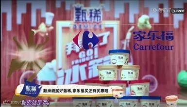 不仅如此,在节目中针对伊利甄稀和黑人牙膏的广告传播,“家乐福有同款哦”的花字更是引导和提示消费者购买行为,打造边看边买的内容提示。让观众看到植入品牌产品时与家乐福产生连结。
