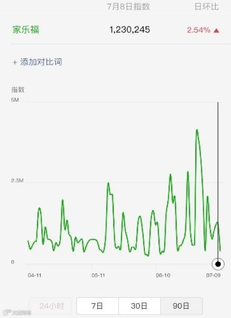 从数据表现来看,从4月末到6月末节目播出期间,家乐福微信指数增长显著。从节目播出前波峰时段的2.3M左右,到节目播出期间最高接近5M,提升了109%。