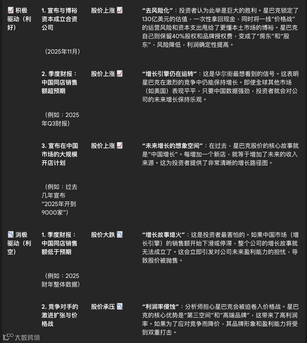 中国市场表现好,门店数量增长,股价就高歌猛进。中国市场一旦失速,竞争加剧,财报就立刻难看,股价应声下跌。