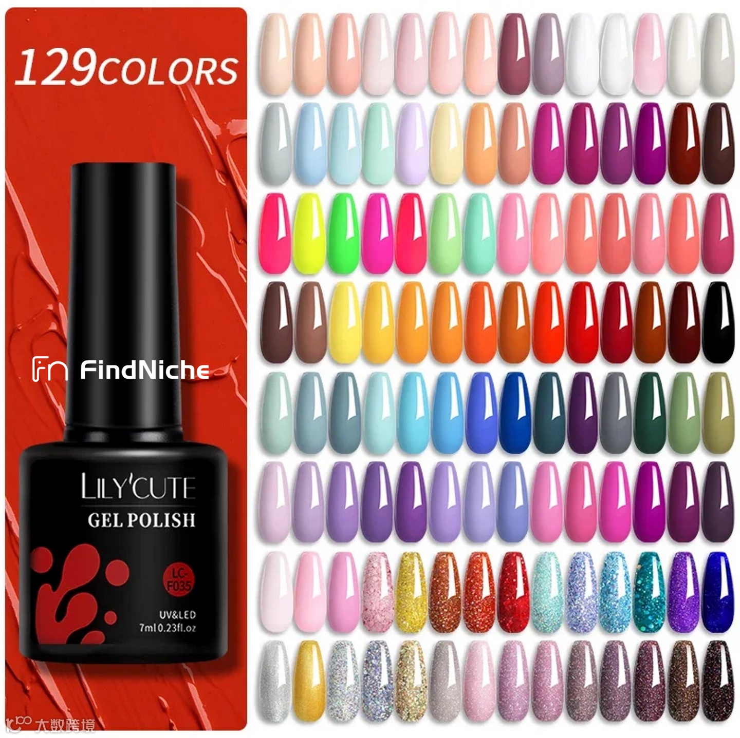 售价$1.2的指甲油,来自品牌LILYCUTE,10月日均销量497单,其中美国订单占比最高,超过23%,同款商品速卖通卖家有17个。从主图就能看出来,这款指甲油的一大卖点是色号非常多,高达129种。