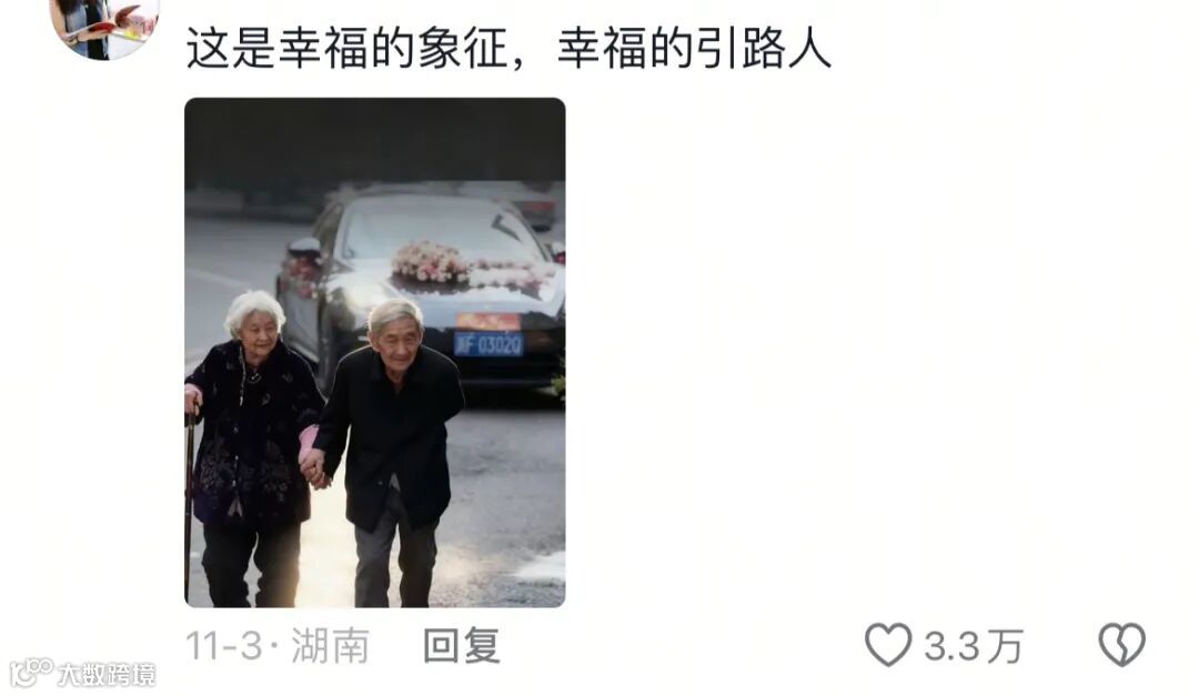 婚车与前方恰巧入镜的白发老人,意外构成了一幅“白头偕老”的圆满图景:
