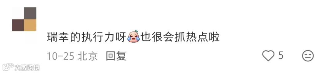 不得不说,这泼天而来的热度,为瑞幸找到了合适的代言人。瑞幸也好像时时刻刻走在冲浪一线一样,追热点的速度实在是够快,没多久就出现在评论区里进行回应,没多久就带来了事件的后续。如果要追剧的话,这种节奏紧凑的剧追起来才有爽感。