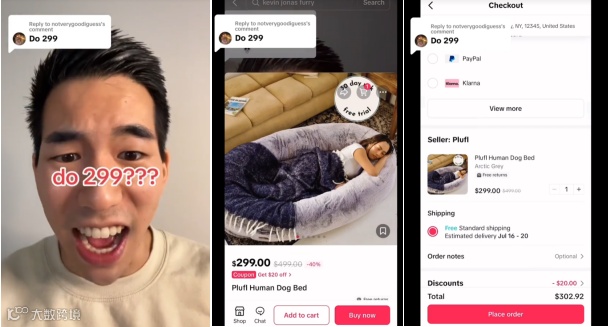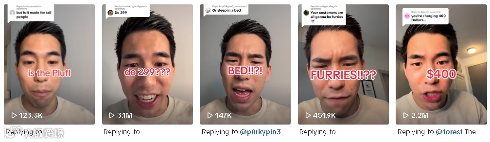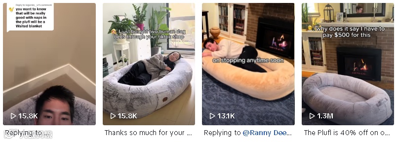 起初人们对 Plufl 持怀疑态度,质疑该产品是否有足够的市场需求。为了弄清楚到底能否大规模生产该设计,Silverman 和 Kinoshita决定尝试TikTok,俩人创建了账号@weareplufl,一开始他们没有太多使用该平台的经验,只知道这是一个推广产品的好地方。2022 年 3 月 9 日,weareplufl发布了第一个视频,展示人类狗床产品的原型,而后产品的潜力被释放了出来,Plufl 也通过火爆的Tik Tok声名鹊起。