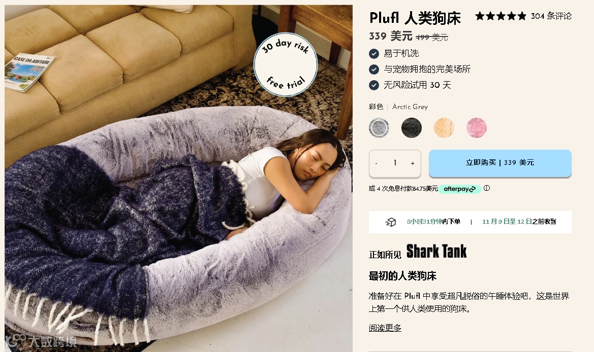 在其店铺中,可以看到该款人类狗床有灰黑黄粉四种颜色可供选择,目前产品的价格已调整至339美元,此前节目中他们透露过该产品的成本在140美元。