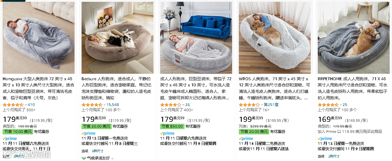 当我们在亚马逊上搜索“人类狗床”时,可以发现与Plufl类似的产品不在少数,价格普遍在150-250美元之间,单从价格来看确实比Plufl实惠,且这些产品基本上都是从2022年下半年或是今年生产的,而且大多也都取得了不错的销量,所以说,热卖品永远有人模仿。