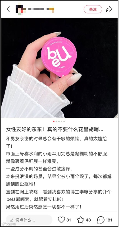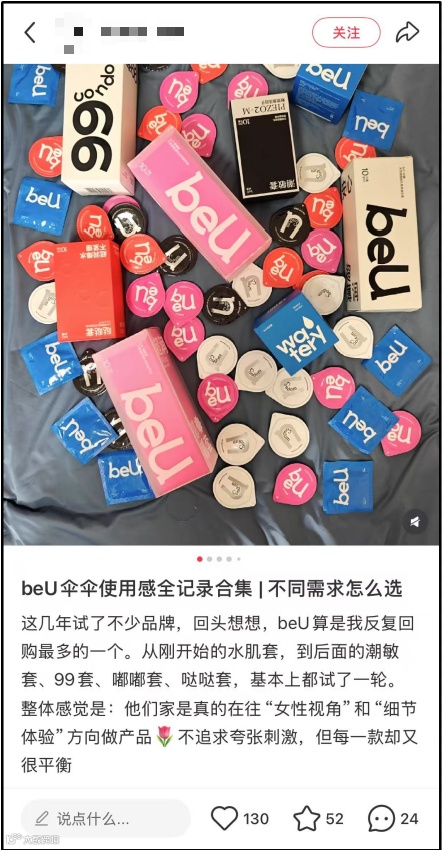 例如品牌明星产品「beU嘟嘟套」,没有像传统产品强调超薄或延时等主要服务于男性体验的功能,而是聚焦于女性用户的使用体感与安全体验,以「超润」作为差异化卖点,精准击中了女性在亲密行为中的基础需求。产品命名(如“嘟嘟套”)和视觉设计(活泼粉色外观)也尝试更柔和、友好的表达,抛弃传统计生用品有暗示性、粗暴刺激的包装,缓解用户的羞耻感。beU用一个个产品设计的创新,解决着当下不同女性那些或大或小的真实身体需求,真正做到用产品对用户情绪需求的回应,希望每一个产品设计希望都能解决一个女性用户未被满足的需求。