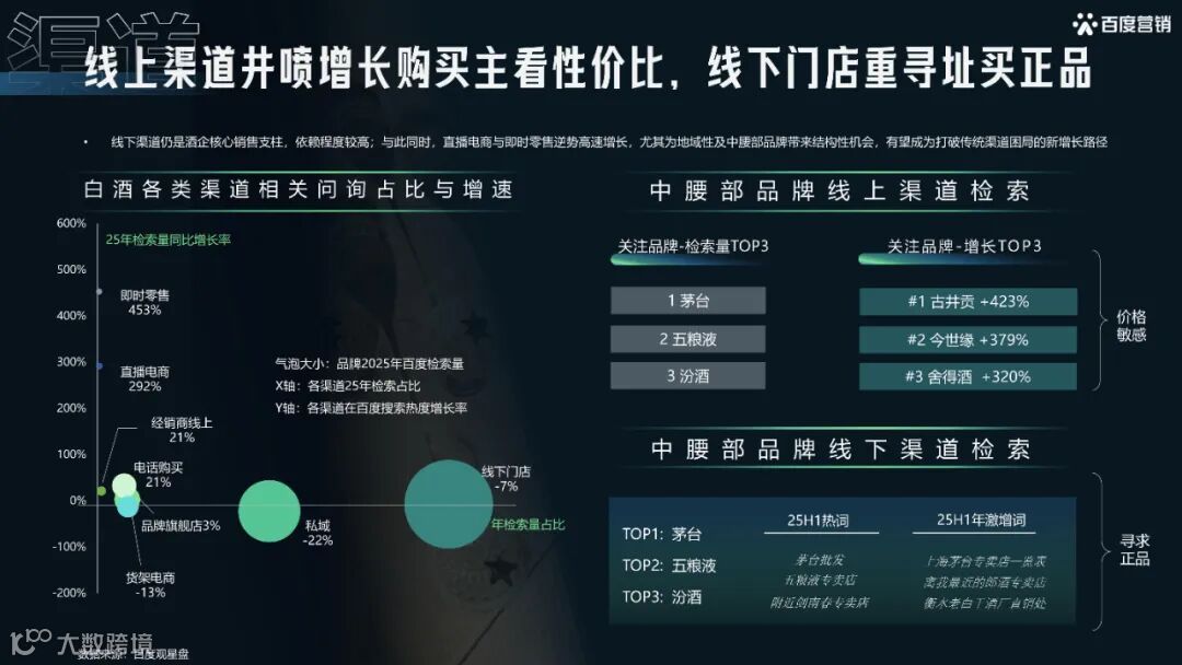 线下渠道管理难以把控,且库存高企,但其仍然是白酒企业的主要销售渠道;线上新兴渠道(直播、即时零售)增长迅猛但许多品牌尚未有效布局。为解决这一现状,百度营销以百度地图赋能线下,精准引流提效;全面拥抱直播电商等新渠道,开辟增长第二曲线。