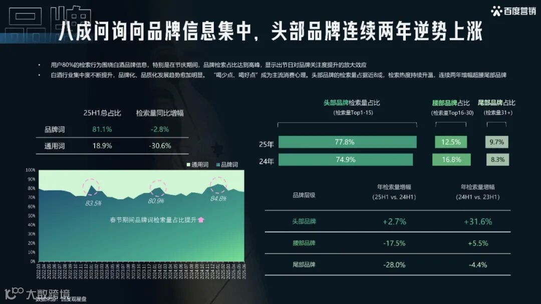 白酒作为中国酿酒产业的核心品类,产能正持续向优势产区集聚,行业发展重点已从规模增长转向品质提升。这一“从量到质”的转变,不仅提升了产品竞争力,也增强了品牌影响力,预示着未来行业将呈现“强者愈强”的格局。百度平台数据显示,约80%的用户搜索行为聚焦于品牌信息,尤其在节庆期间,品牌搜索量的显著增长反映出节日对品牌关注度的提升效应。其中,头部品牌的搜索量占比超过70%,且增长速度连续两年明显高于中腰部品牌,既体现了市场对高品质白酒的旺盛需求,也凸显了行业竞争的不断加剧。