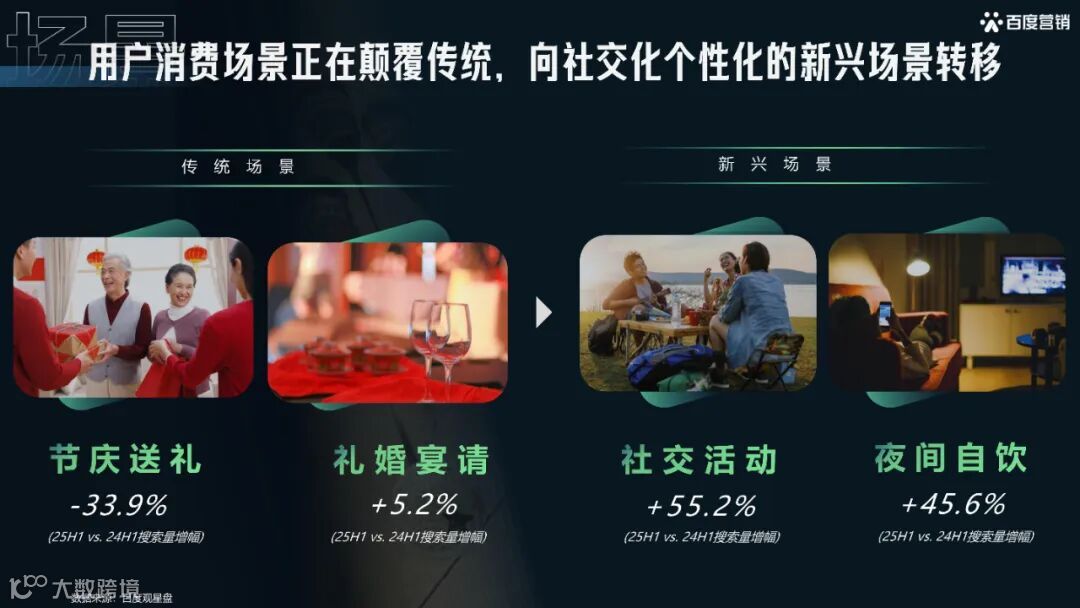 从数据中我们明显感受到,白酒用户的消费场景正在颠覆传统。尤其是以节庆送礼为代表的传统场景,搜索量出现了 -33.9% 的明显下滑。相比之下,社交活动和夜间自饮场景则呈现出强劲的增长势头,搜索量增幅分别达到 55.2% 和 45.6%。白酒消费正逐渐从传统的正式场合向更加社交化和个性化的场景转移。