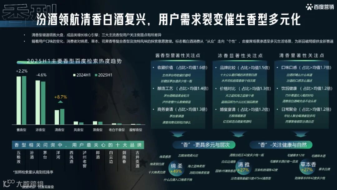香型,是白酒的灵魂所在,亦是其独特魅力与价值表达的根基。25年清香型白酒热度持续领跑,展现出强劲的市场潜力。从用户认知与需求层面看,三大主流香型已形成差异化的定位格局:酱香型白酒与收藏价值、精湛工艺及高端商务场景深度绑定;浓香型则侧重于品牌力对比、价格区间以及婚宴等大众宴请场合;清香型更聚焦于纯净口感、饮后舒适度及日常聚饮等高频生活场景。