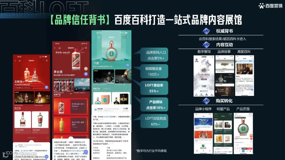 百度LOFT为白酒品牌打造了一站式品牌内容展馆,为品牌提供了强大的信任背书。在内容呈现上,通过百科搜索结果或超品百科卡进入,用户可以获取权威背书、进行内容互动,还能参观数字展馆、了解品牌故事、查看高管百科等,从而帮助用户全面了解品牌;从购买转化角度来看,百科loft可以引导用户进入品牌小程序、浏览明星产品和产品页面,从而促进购买转化通用词百科则能够通过绑定通用热词,如节庆热词或行业权威大词,能够帮助品牌更前置占据用户心智,在消费者进行通用词搜索时,自然地产生品牌联想,从而提升品牌的知名度和影响力,为品牌信任夯实基础。