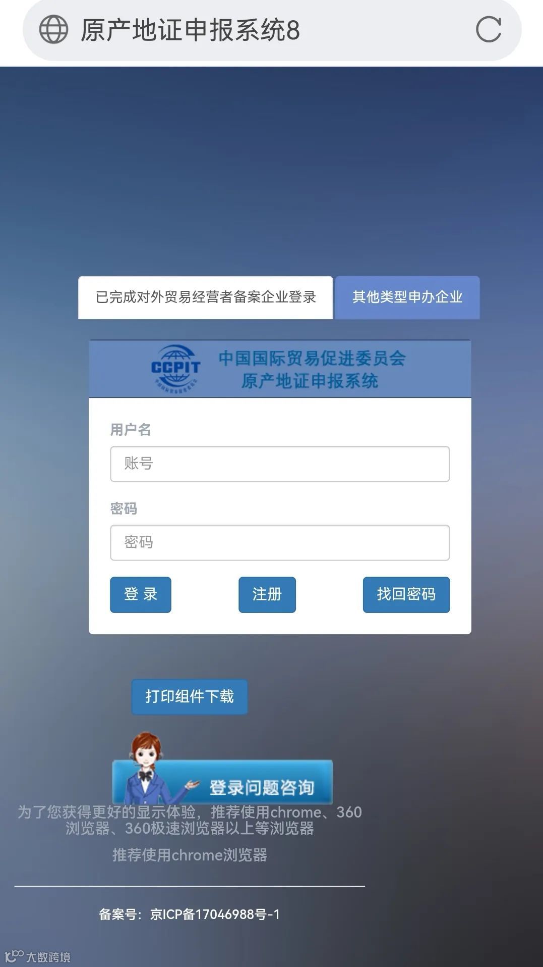 贸促会证书通过中国国际贸易促进委员会原产地证申报系统办理,需先完成企业注册备案[k];