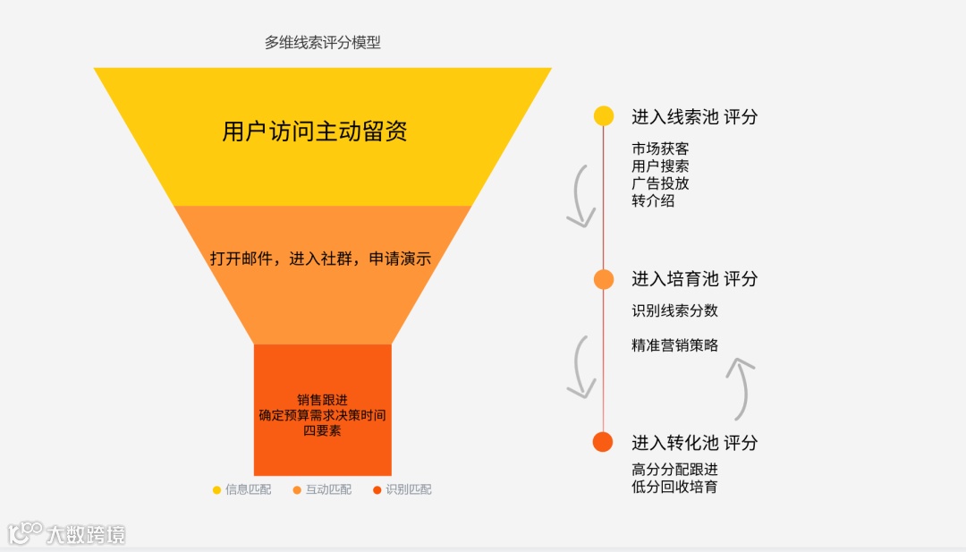 与动态的客户生命周期数据相结合,生成漏斗评分模型,加入动态的维度,对于整个客户线索的识别会更加完整更加立体。