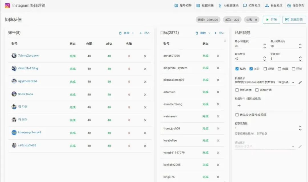 当精准的数据遇上专业的形象,最后一步就是开启对话。而手动发送海量个性化私信几乎是不可能完成的任务,这正是Instagram群发软件的核心价值所在。