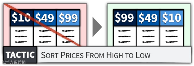 例如,根据大量的测试结果results from numerous A/B tests,,你可以通过把价格单按照从最昂贵到最便宜的方式排序来增加收入。