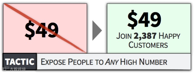 举个例子,如果你开的是一家网店,你可以把店里的总买家数量写在你的价格数字之前,这样,人们形成价格认知的时候就会受到这个较大数字的锚定效应影响,他们会更能接受较高的价格。