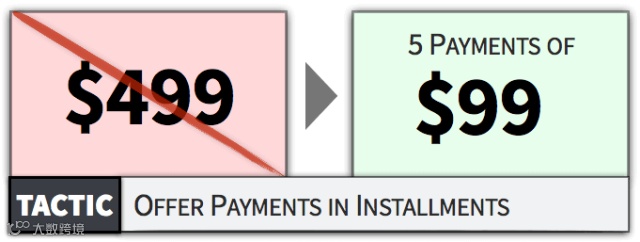 假设你有一门$499的网课,就可以通过分期付款提升价格竞争力(分5期,每期$99)。消费者决策时会更倾向用分期额度与对手全款价格相比较——这样你的价格就会相当有吸引力。