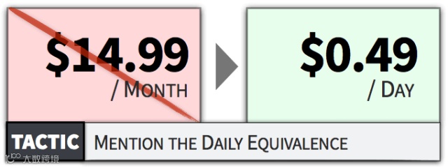 接续上条技巧,可以将价格折算为每日等值价格(比如, $0.87/天). 这种算法也会让消费者产生总价较低的认知。