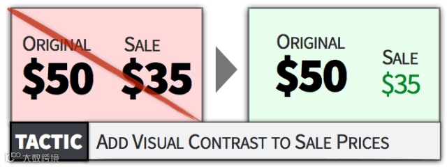 当你将参考价格与自己的价格在视觉上强化区隔(如使用不同的字体颜色)时,流畅效应就开始发挥作用了。消费者会将视觉的区隔转化为更加显著的数值区隔。