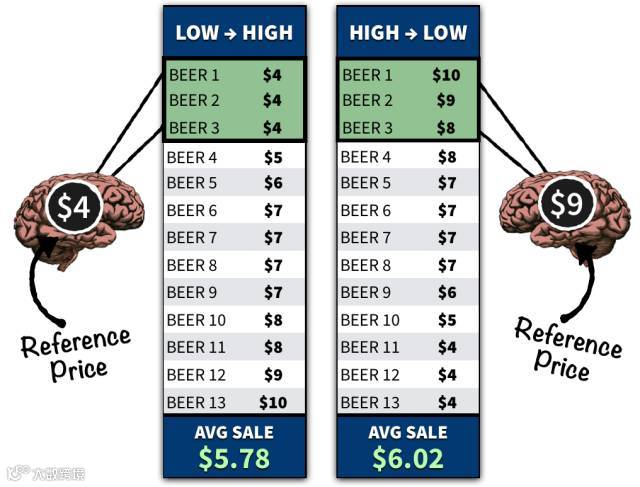 在一个酒吧中测试了这个论点,测试为时8周(样本是1195份啤酒),通过随机改变产品的排序而进行测试。当他们将产品按照价格从高到低的顺序排列时,获得的营业利润最高。