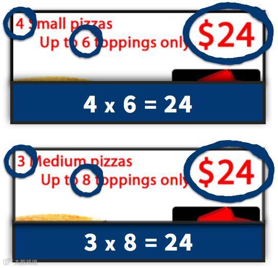 当广告中出现最终价格的两个约数时,消费者可以很轻易的算出来其乘积-也就是真实价格。这个价格的正确性被大脑肯定了。这种运算正确的愉悦感会被混淆为对价格的倾向于认同。