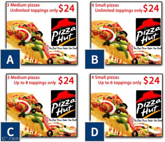 这是个很妙的招术。我们向志愿者展示了如下几张pizza海报,前两张提供无上限饼心儿加料-很实惠。但是,调研结果却显示人们更倾向另外两张海报。