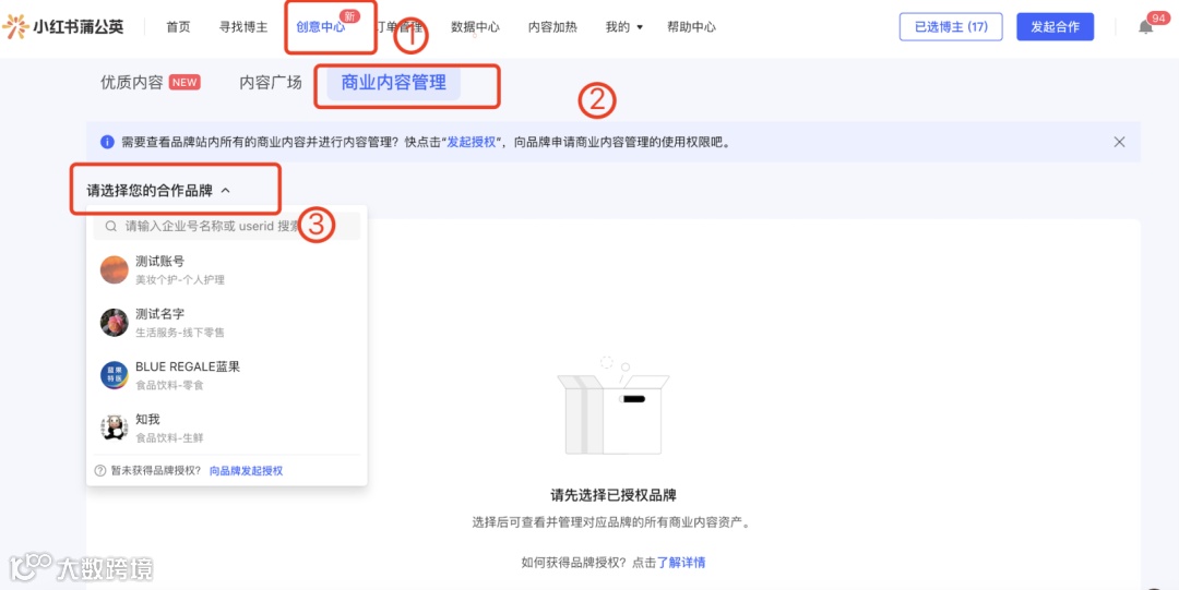 ●代理侧:选择【创意中心】,点击列表处【商业内容管理】,点击【请选择您的合作品牌】,进入该页面。