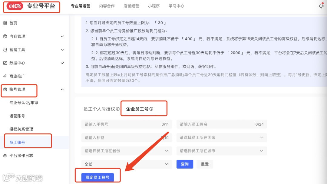 2. 若30个上限无法满足企业经营诉求,可通过提升员工号竞价推广消耗(含种草、客资收集等,不含薯条)提升绑定数量上限;