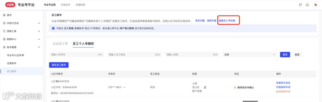 登录专业号平台员工账号管理页面,点击【查看员工号权限】,可对相关权限进行管理