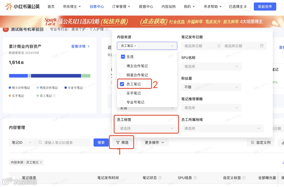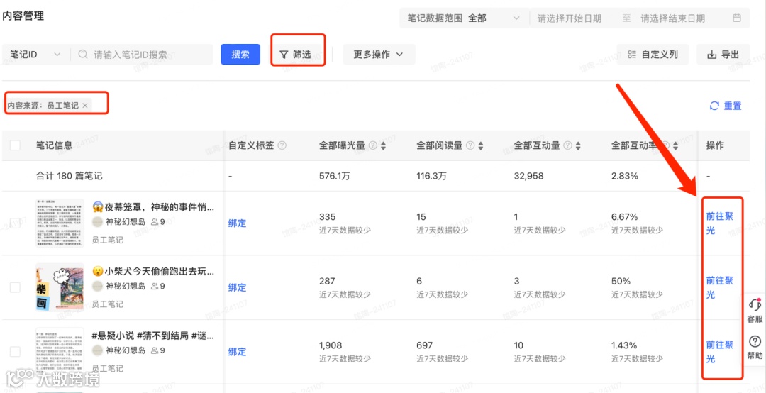 1. 查看&筛选员工笔记、去投广:【商业内容管理】>>【筛选】列表可按需筛选笔记。