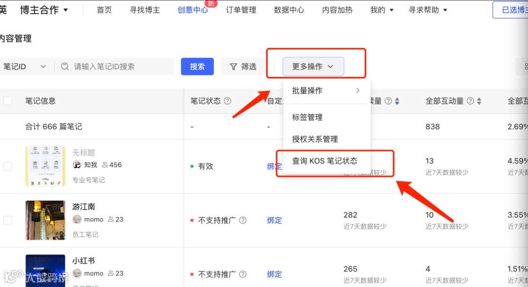 2. 查询KOS笔记状态:在【商业内容管理】>>【更多操作】>>【查询KOS笔记状态】可查询笔记状态