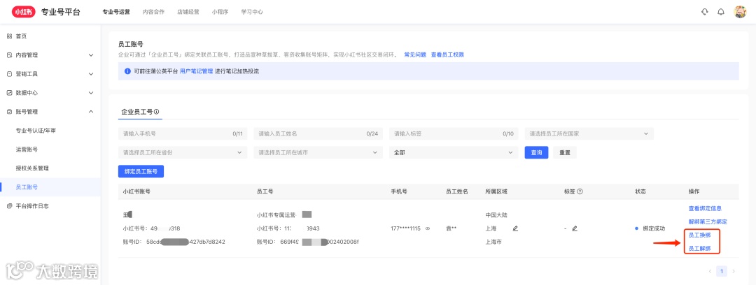 2. 企业员工号:企业员工号不支持一切解绑行为,一旦绑定,账号无法转移至其他企业或变更为个人账号。