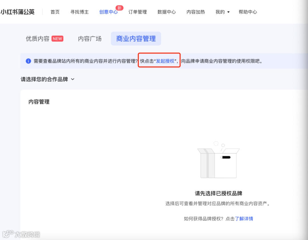 代理商可点击【发起授权】向品牌申请商业内容管理的使用权限