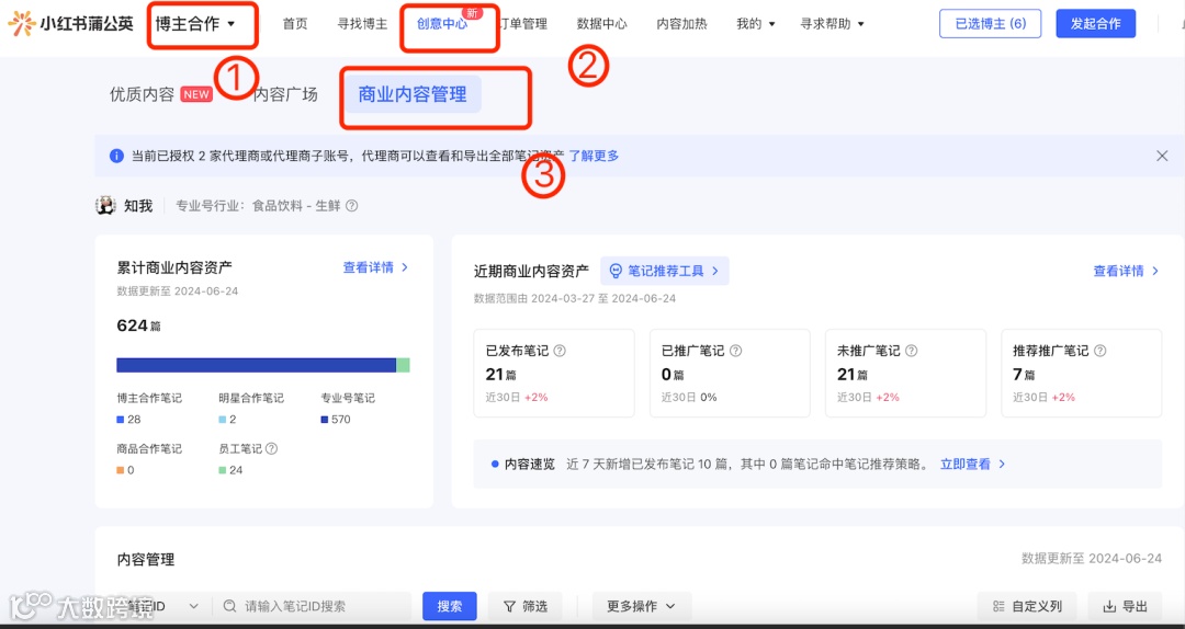 ● 品牌侧:左上角切换至【博主合作】,选择【创意中心】,点击【商业内容管理】,进入该页面。