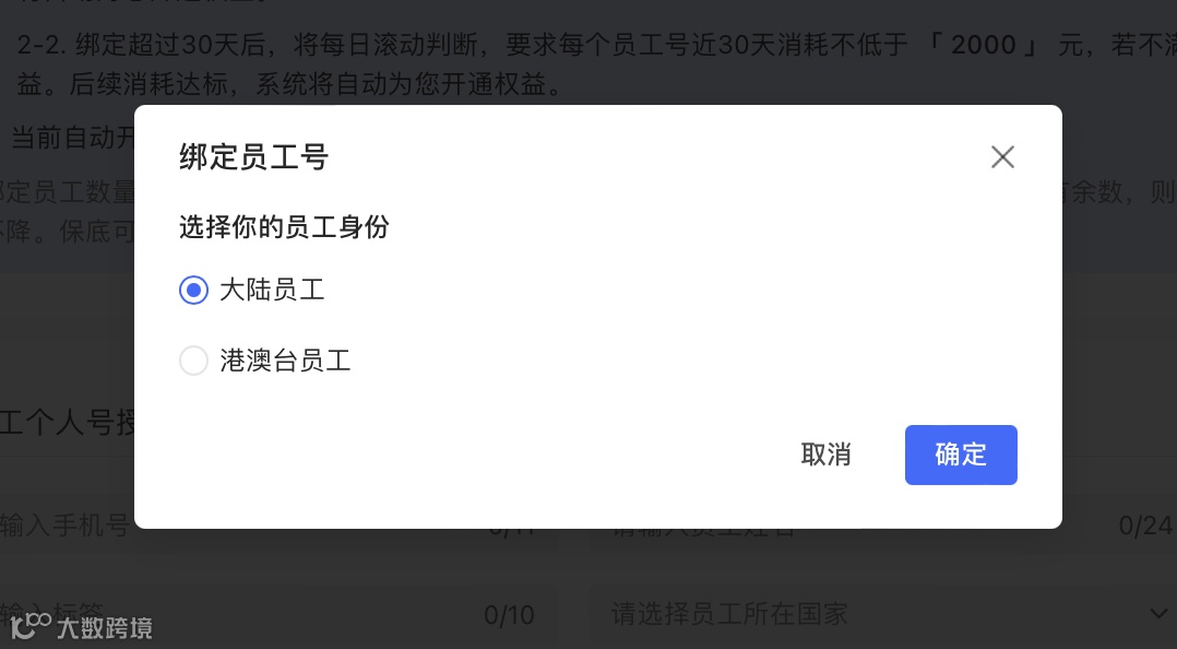 1. 考核单个员工号的竞价推广消耗,每日滚动判断是否满足消耗门槛:满足则享受所有员工号权益,不满足,则关闭相关高级权益