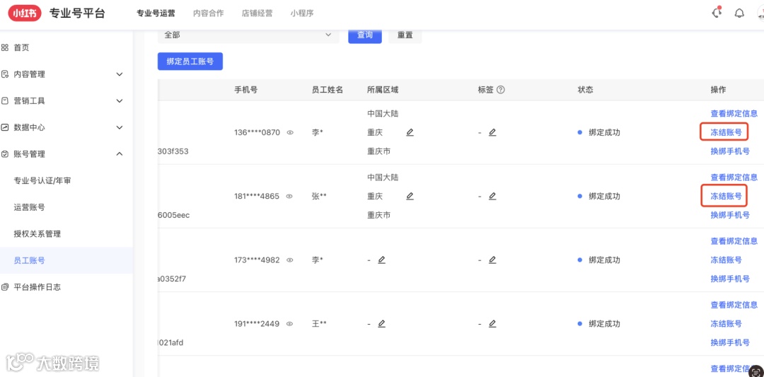 3. 操作路径:专业号平台-账号管理-员工账号-企业员工号-操作-冻结账号
