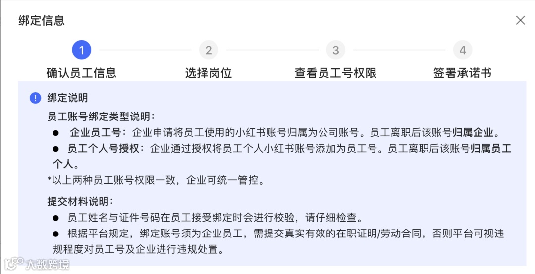 ● 绑定的小红书号的实名信息必须和企业在专业号后台填的员工实名信息一致