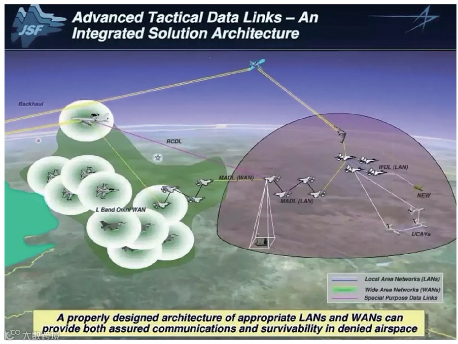 当前F-35标配的多功能先进数据链(MADL)可实现视距内隐身平台间的加密通信,适用于B-21等新一代隐身飞机。然而该系统受限于视距范围,无法覆盖广阔战场。面对来自太空、海面、地面和空中多源传感器的海量数据,单一平台信息处理能力显得不足,且非MADL平台难以接入[k]。