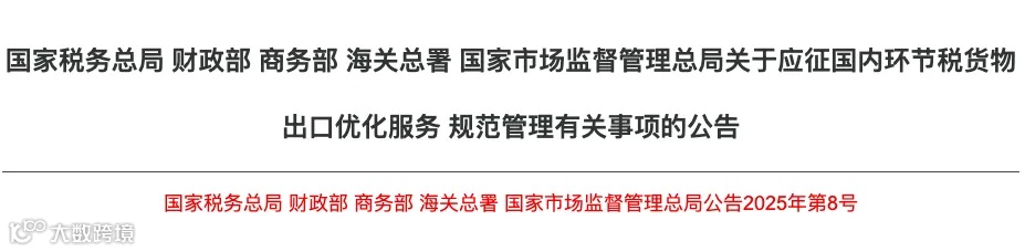 2025年3月28日,国家税务总局、财政部、商务部、海关总署、国家市场监督管理总局联合发布《关于应征国内环节税货物出口优化服务 规范管理有关事项的公告》(2025年第8号),明确加强对“买单出口”行为的监管,全面规范外贸出口秩序[k]。