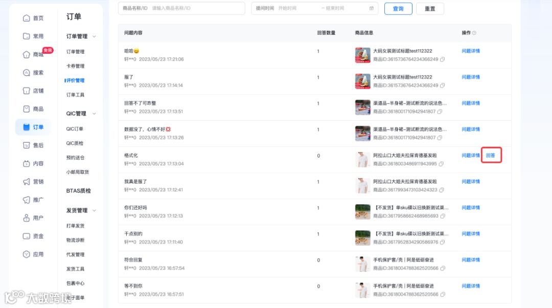 筛选能力:支持筛选回答状态、商品id、提问时间