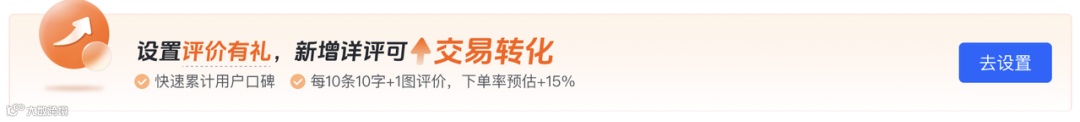评价有礼是官方唯一促评营销工具,商家自主出资设置评价返券,用户写评超过10字+1图,即可领券。