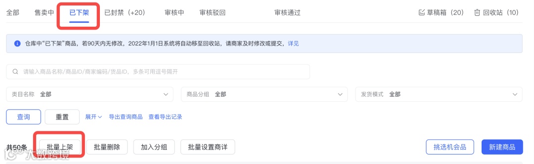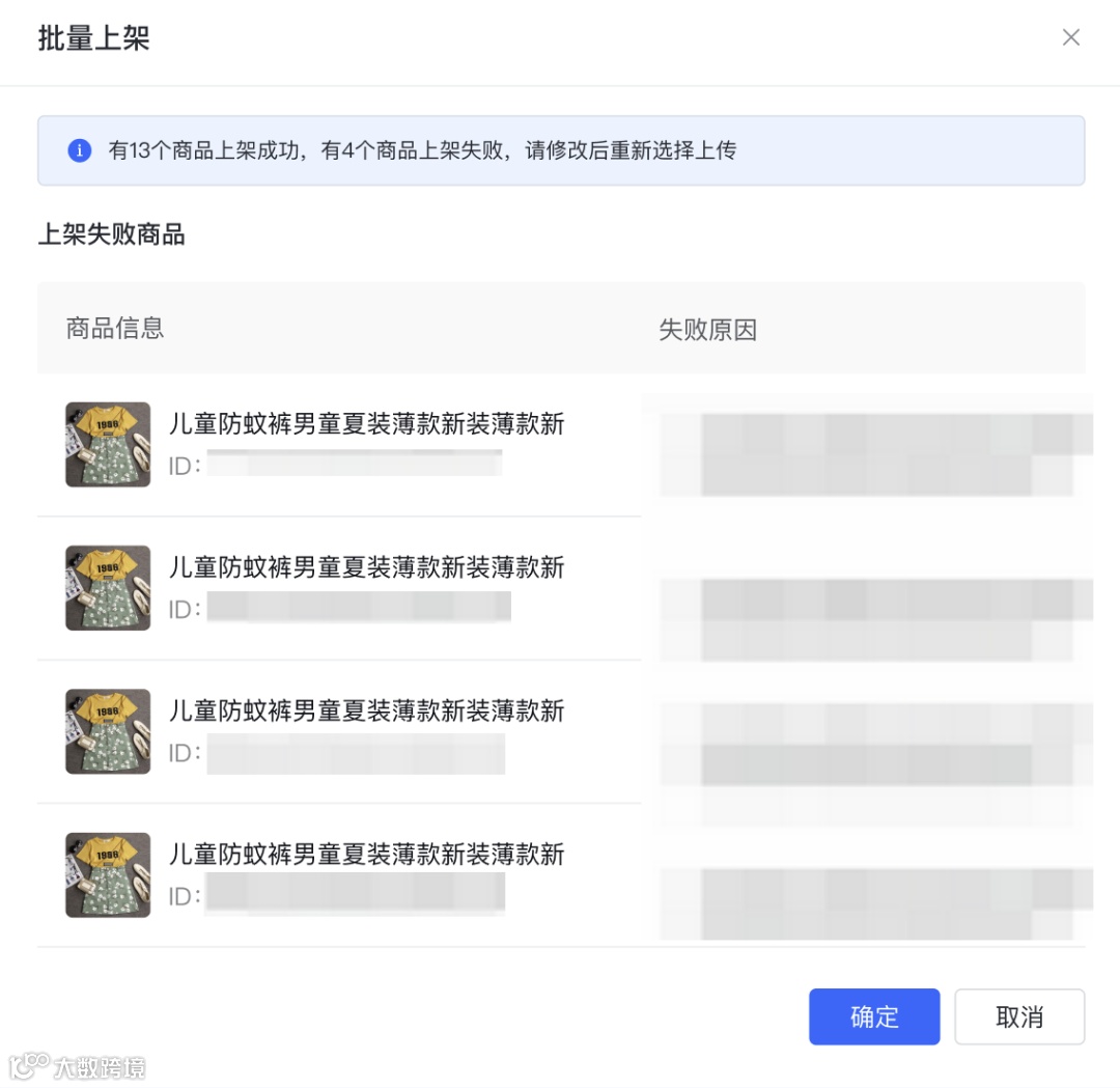 支持针对“已下架”状态商品,点击操作“批量上架”,当部分/全部商品上架失败时,页面将做失败商品原因说明