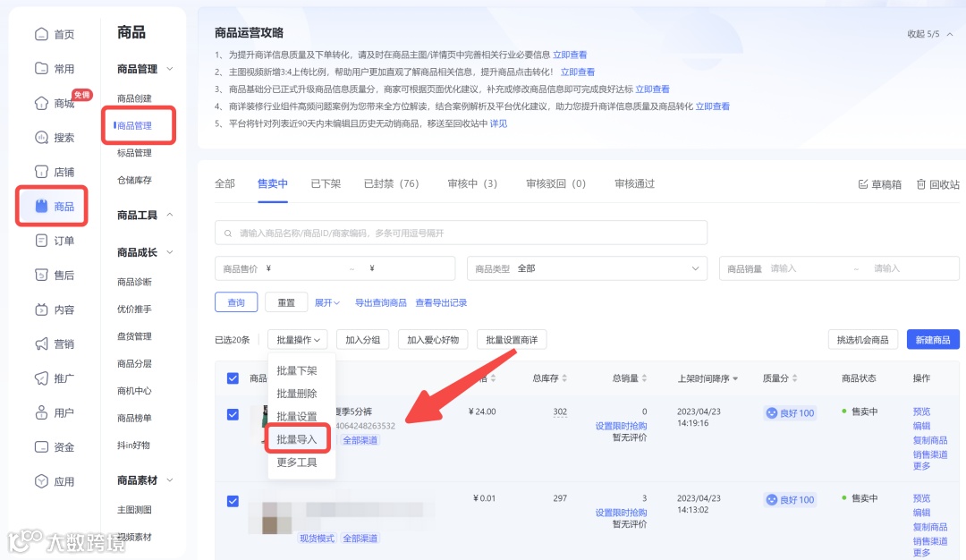 - 针对历史已过审“放入仓库”中的商品,如后续未对商品做信息更改希望快速上架,只需在列表中点击“上架”按钮,商品将直接进入售卖中列表,此时商品为上架状态。反之,则需要先通过商品审核,审核通过后,则商品上架。