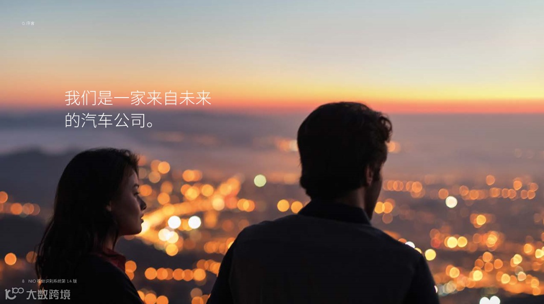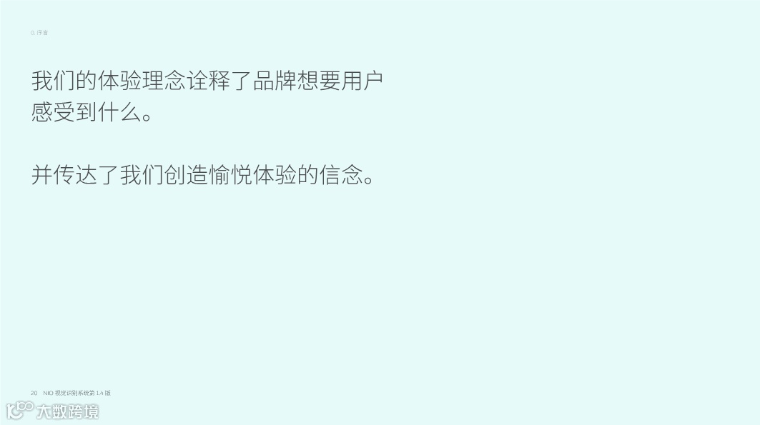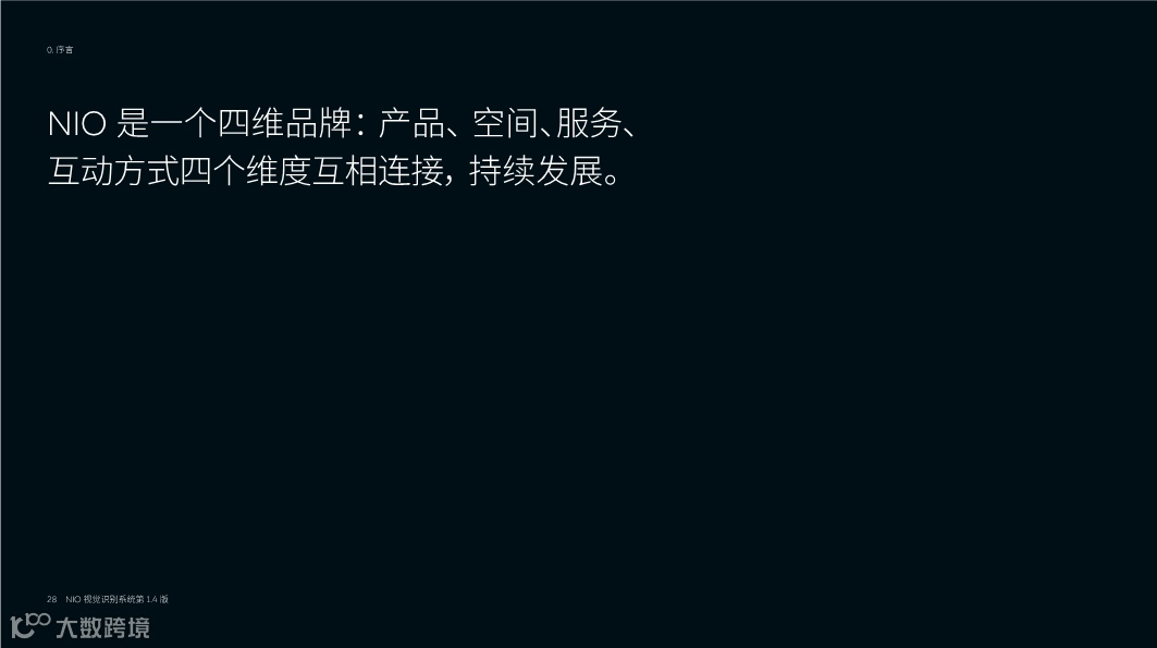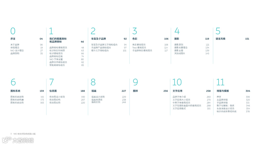 本文档是NIO蔚来汽车的品牌视觉识别系统手册(1.4版),全面定义了品牌视觉元素的规范与应用标准。手册包含11个核心章节,涵盖品牌标识系统(图案商标、品牌商标)、子品牌架构、色彩体系(主色调Teal及辅助色)、摄影原则、语言风格、图标系统、信息图设计、插画风格、文字排版规范等。